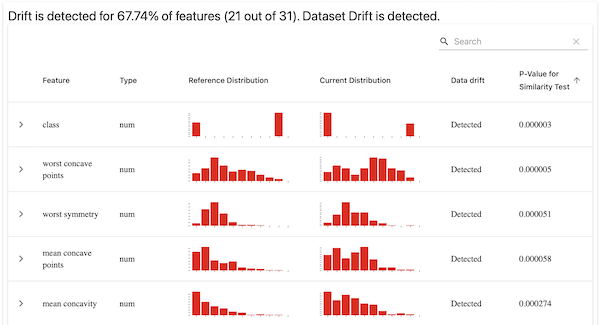 You can output the results of this calculation in the form of a JSON object or dictionary (called a Profile in Evidently) which contains all the raw conclusions that their tool has made. You can easily see which features have drifted, and there’s also statistical information provided to be able to make more fine-grained decisions. Indeed, it’s this output that you’ll likely be using in a continuous training setting, where the presence of drift is likely to need something like some retraining of your model or some more intensive involvement and investigation from your data team.