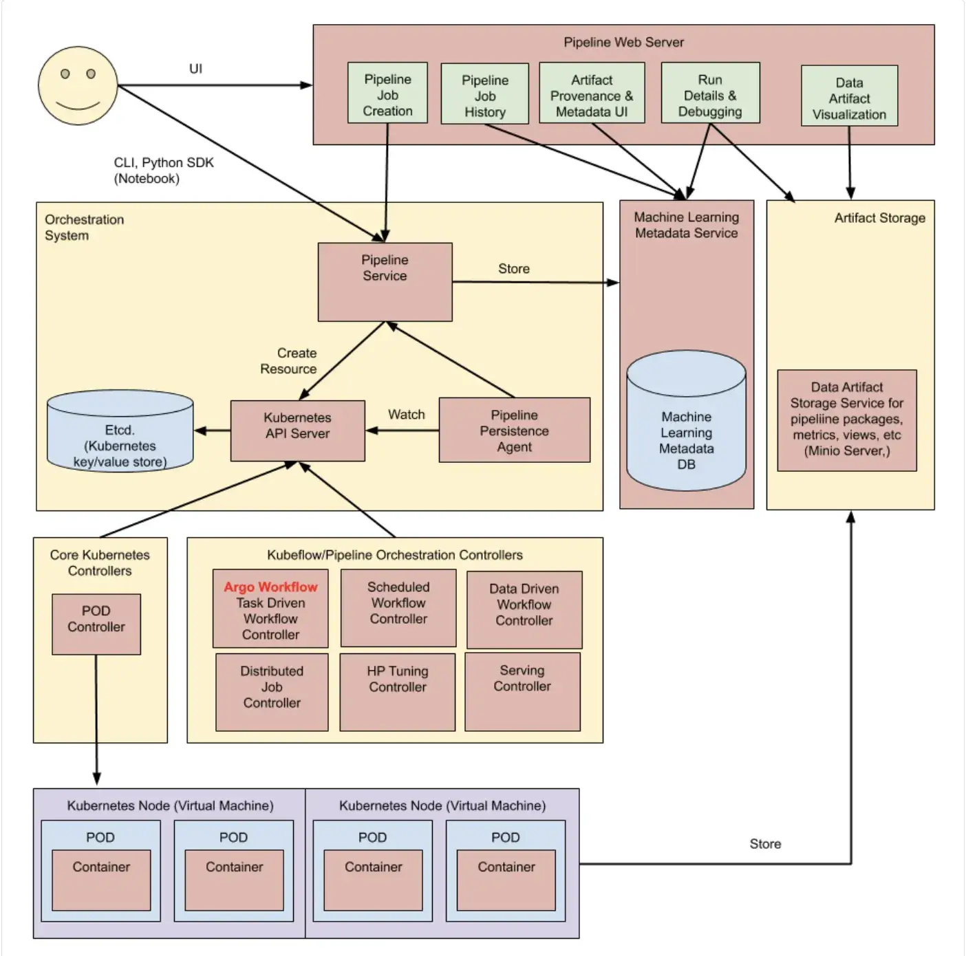 Kubeflow relies on the Kubernetes control plane to manage execution. It uses Custom Resource Definitions (CRDs) to define pipelines and the Argo Workflow engine to execute them.