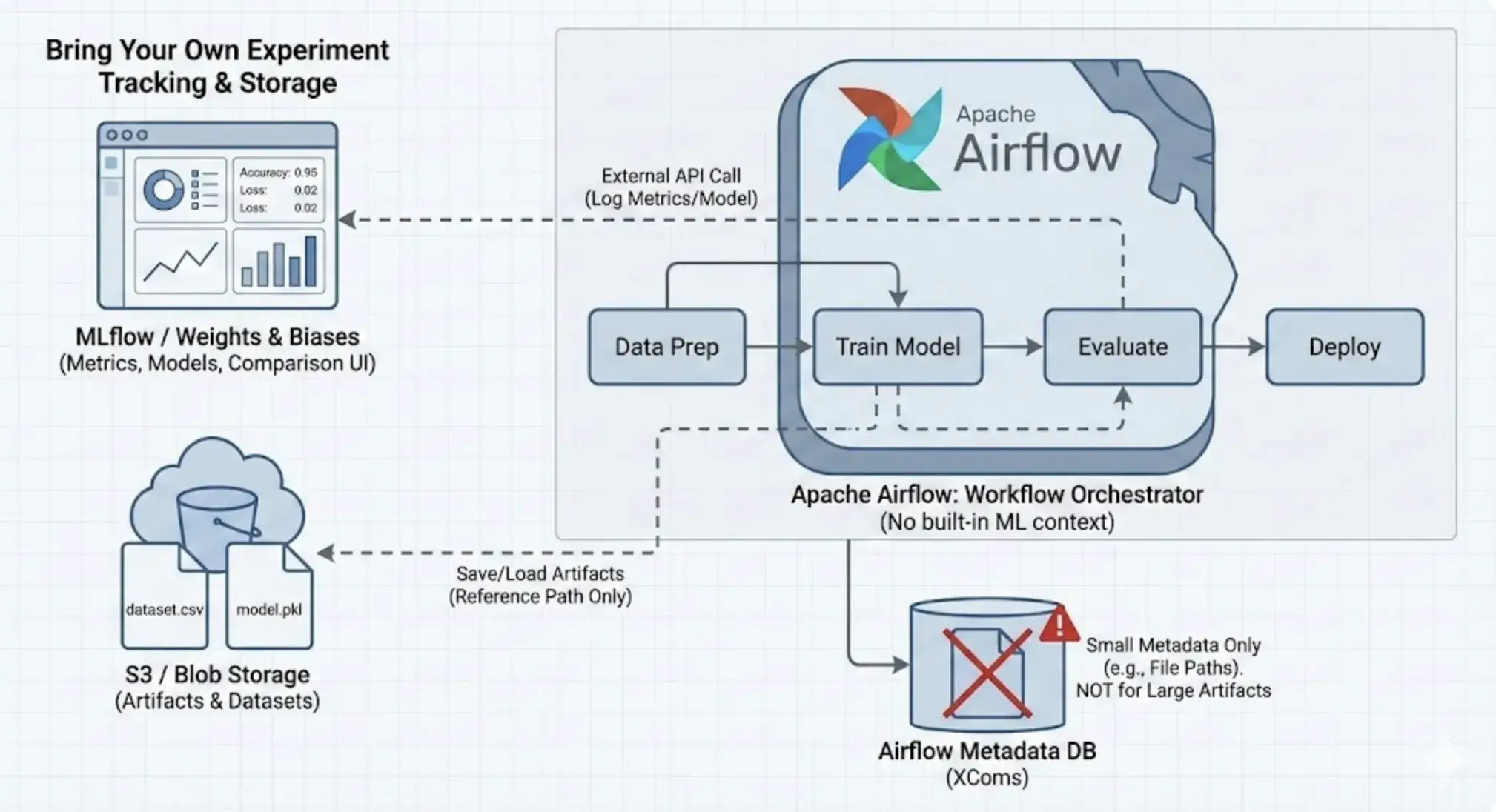 Airflow has no built-in concept of ML artifacts. It doesn’t inherently know that a file is a dataset or that a model was produced.