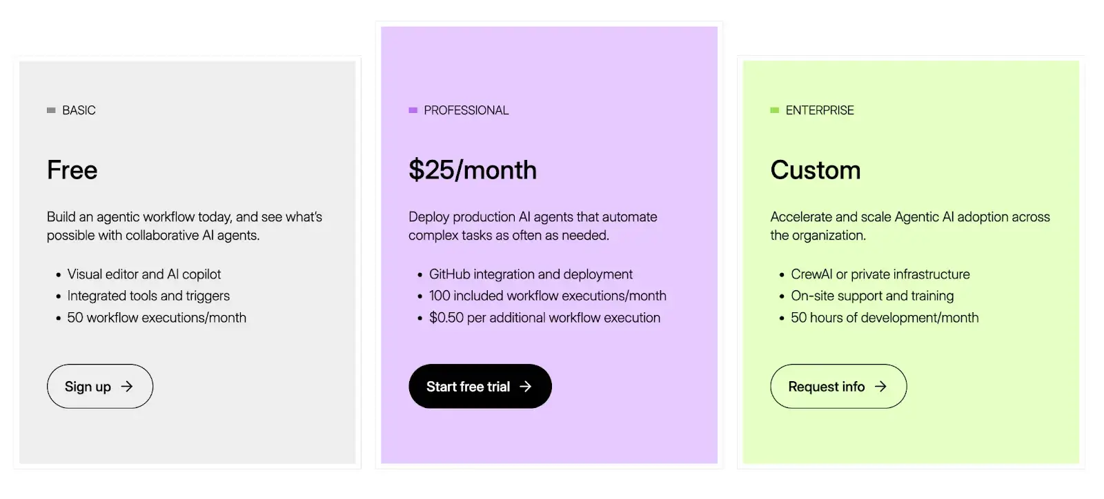CrewAI offers a free, open-source framework. For a managed experience, it provides three pricing plans:
