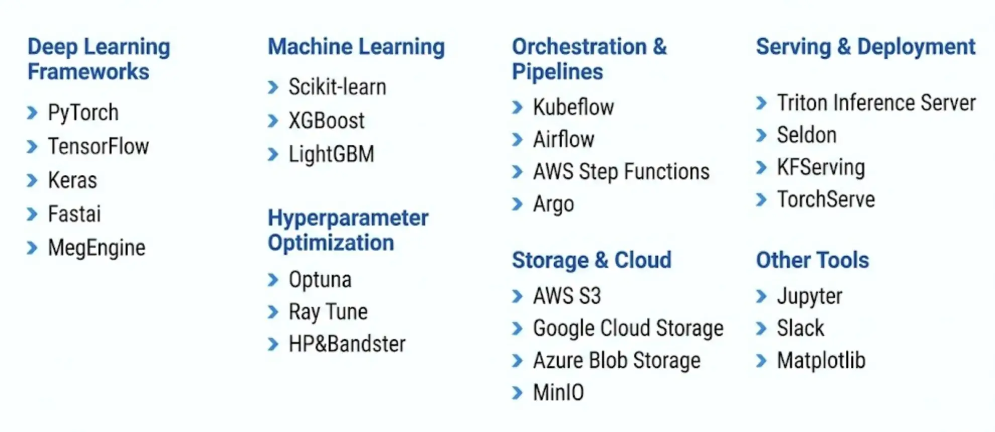 - Experiment Tracker: MLflow, Weights & Biases, TensorBoard, etc.