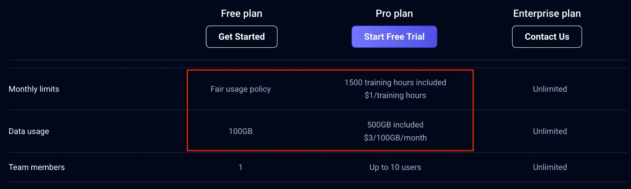 Once you move to Enterprise, Comet’s published plan limits for training hours and data usage are removed (both are listed as unlimited). The remaining “constraint” is contractual: pricing and terms are negotiated, and you still need internal cost attribution if multiple teams share one account.