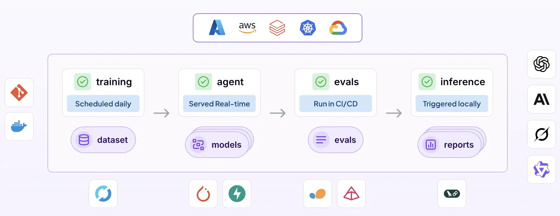 ZenML is the workflow layer that turns evaluation from a dashboard activity into a repeatable pipeline. You define eval runs as steps, persist outputs as artifacts, and keep metric lineage intact across versions. It’s CI-friendly by design, and you can swap trackers, registries, and judges without rewriting pipeline code.