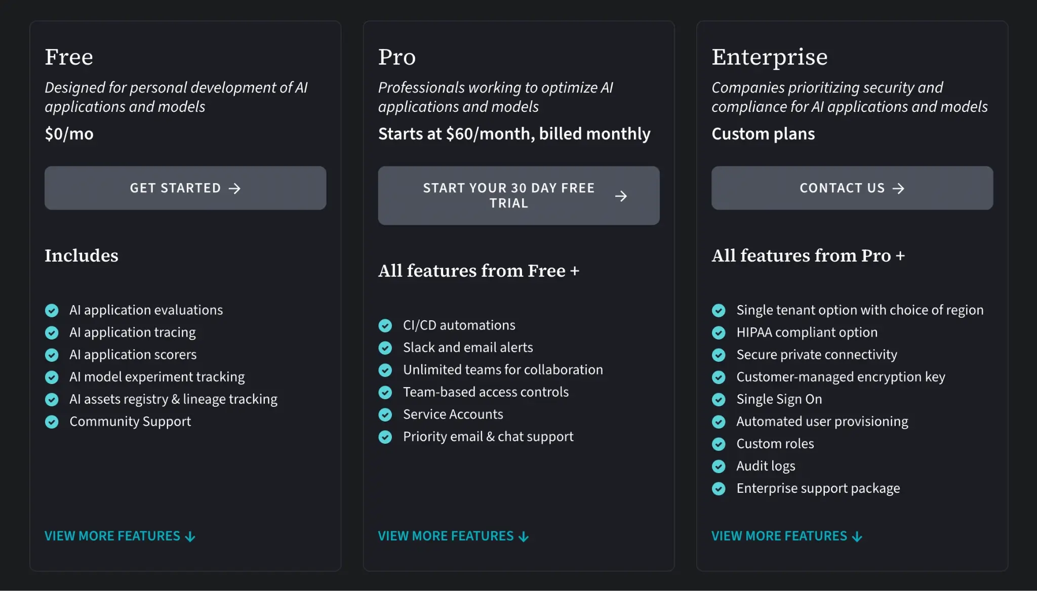 👀 Note: Comet is the company name, and the product lineup includes both Comet MLOps (experiment management) and Opik (GenAI observability and evaluation), which have different pricing models and plan limits.