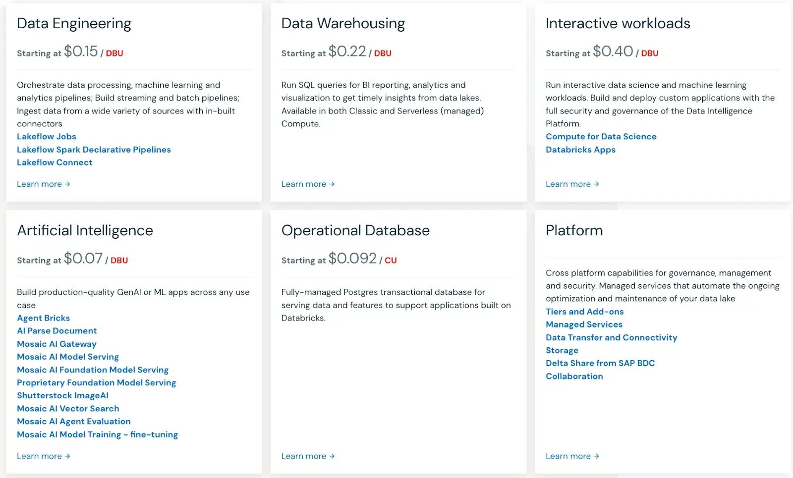 Databricks pricing is usage-based. Databricks cites Mosaic AI Agent Evaluation at $0.15 per million input tokens and $0.60 per million output tokens.