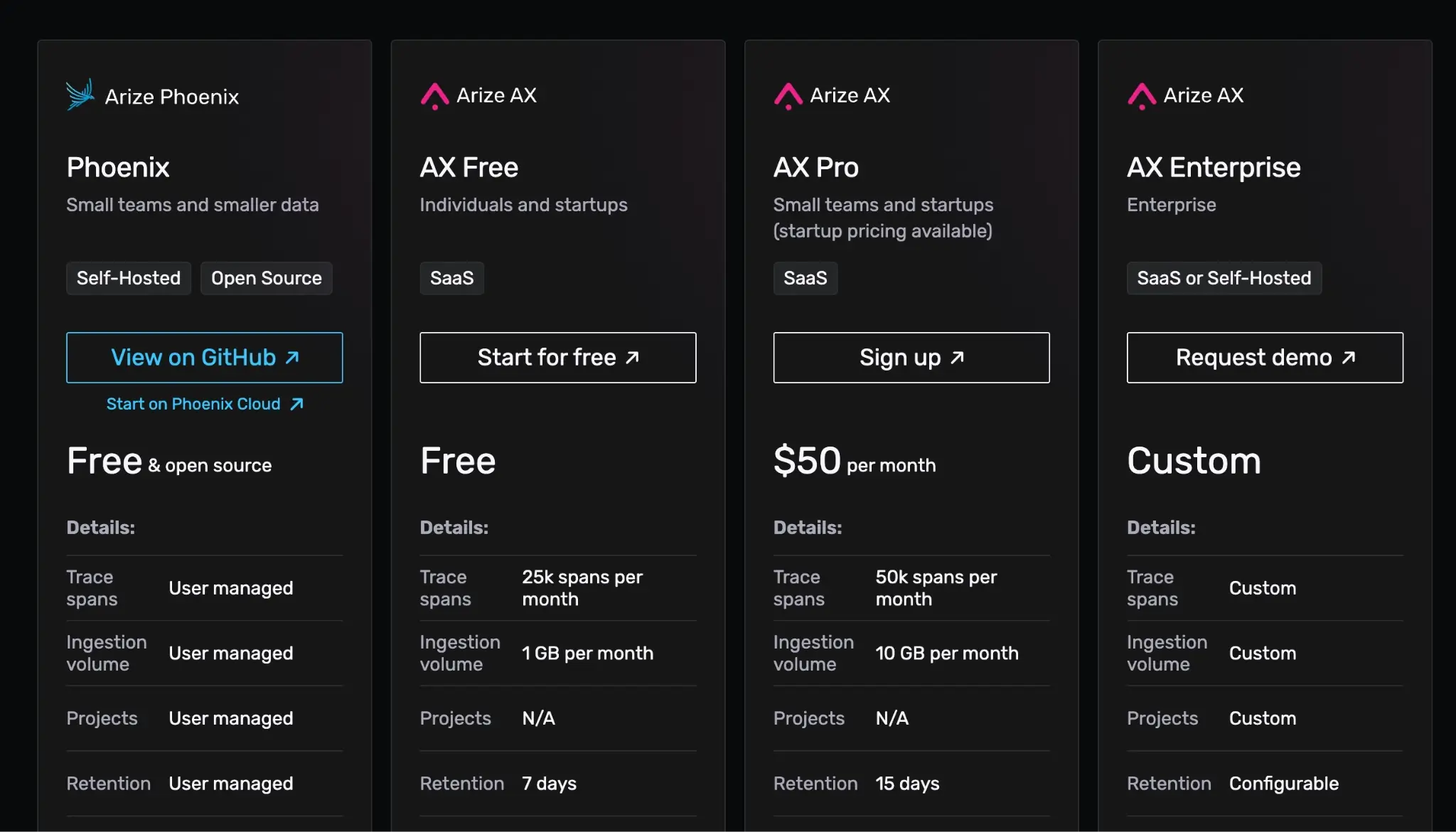 Phoenix is free to self-host and source-available under the Elastic License 2.0 (ELv2). For managed cloud usage, Arize offers AX plans (including a free tier) with paid tiers starting at $50/month and Enterprise with custom pricing.