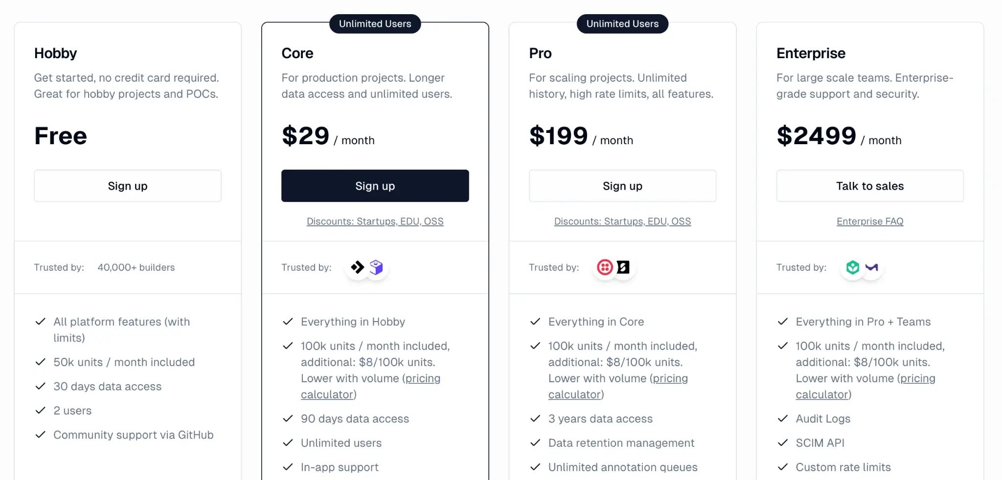 Langfuse offers a generous free plan for hobbyists and individual developers. Other than that, it has three paid plans: