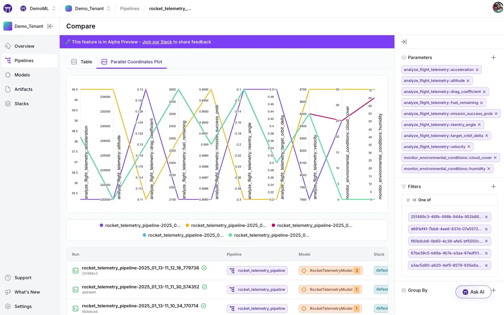 The ZenML Pro dashboard allows in-depth experiment comparisons – for example, side-by-side pipeline run metrics and even parallel coordinates plots to analyze differences across runs.