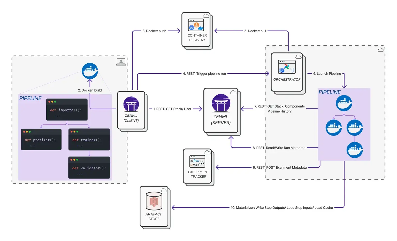 ZenML tracks the relationships between steps and artifacts, creating a complete data lineage for each pipeline run. This ensures you can trace which data version produced which model, similar to DVC’s data-provenance, but at a pipeline level.