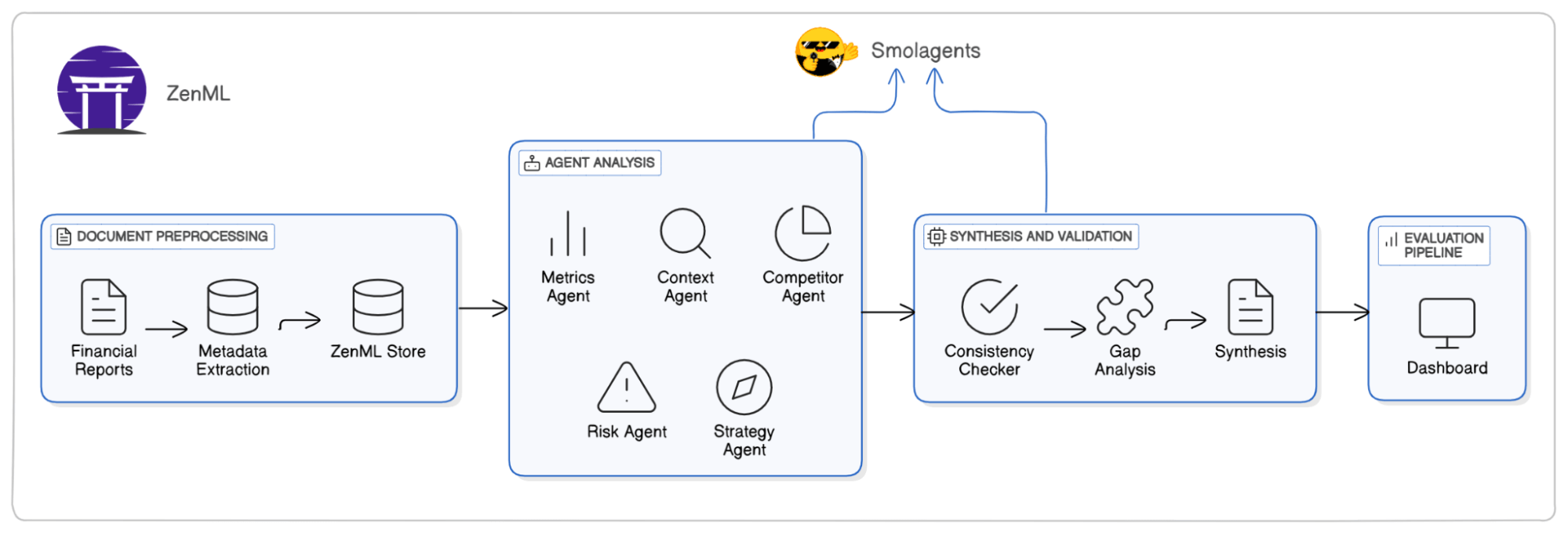 To tackle this, we’re building a financial report analysis pipeline using ZenML and SmolAgents. ZenML provides a structured way to manage our data pipelines, while SmolAgents offers lightweight, flexible AI agents that can process documents and extract key insights. Instead of running a single monolithic LLM call, we break the problem into chained steps: extracting, summarizing, and refining key insights across multiple stages.