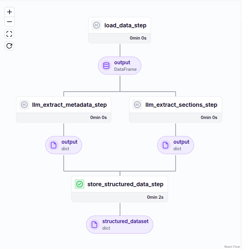 Financial reports are ingested, and metadata extraction is performed. Next, the extracted metadata is stored in the ZenML Store, ensuring structured data management.