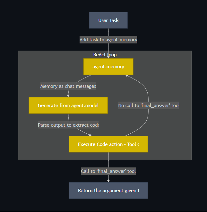 This approach is inspired by ReAct (Reasoning + Acting) agents, a framework where the agent reasons out loud and performs actions to solve tasks. CodeAgents are like ReAct—but with Python code as the "act" part.