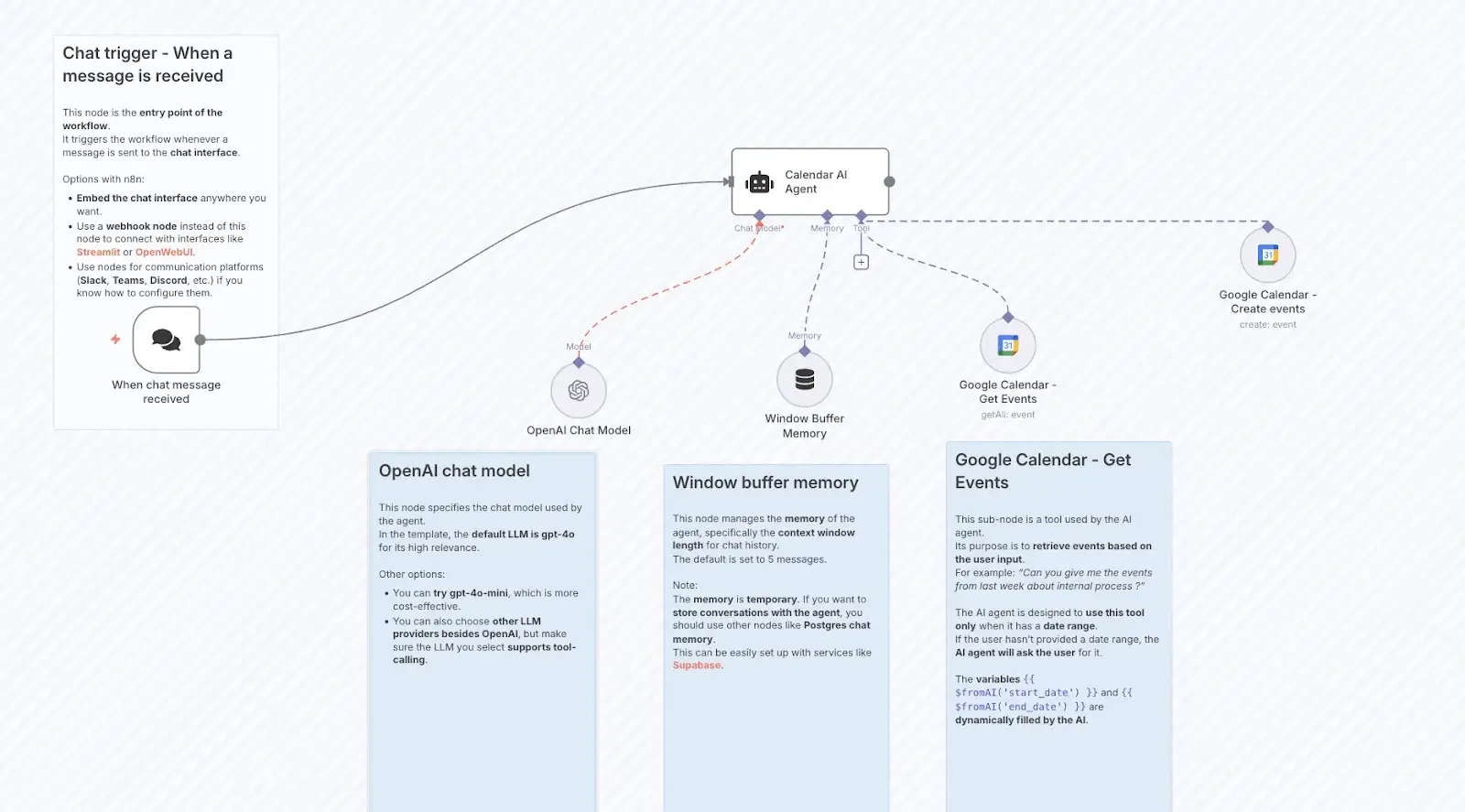 Below is a perfect example of a Tools Agent that acts as a Google Calendar Assistant.
