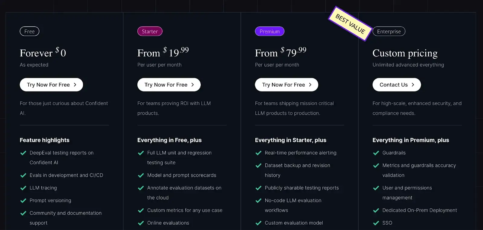 Confident AI is completely free and open-source. It also offers a free cloud tier for basic use. This is followed by three paid plans: