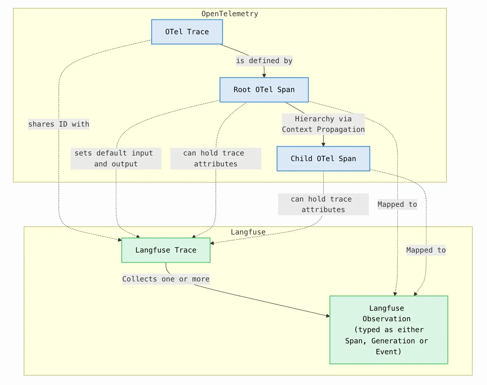 Observability in LLM applications begins with detailed tracing, which captures the execution path of a single request. Both Langfuse and Phoenix use hierarchical data models inspired by OpenTelemetry (OTel).