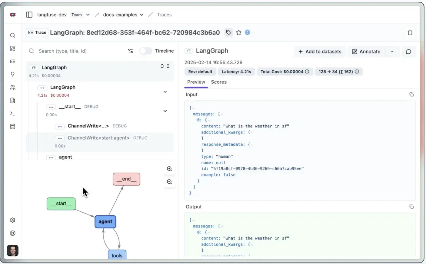 The result is a full trace timeline that clearly visualizes the path from user input to final output.