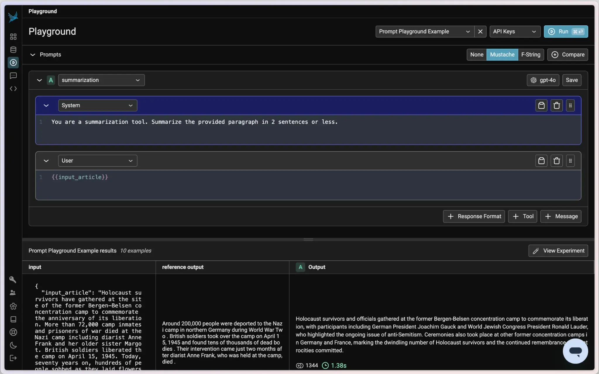 Phoenix offers an equally accessible Prompt Playground, where users can design, test, and store prompt templates. The playground supports version control, side-by-side model comparisons, and batch evaluations over datasets. You can replay past traces to refine prompts directly from observed failures.