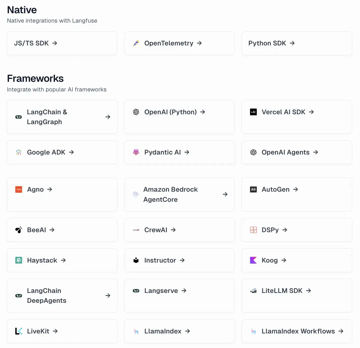 Langfuse offers one of the broadest integration ecosystems in LLM observability. Because it’s framework-agnostic and OTel-compliant, you can connect Langfuse to nearly any component in your workflow with minimal setup.