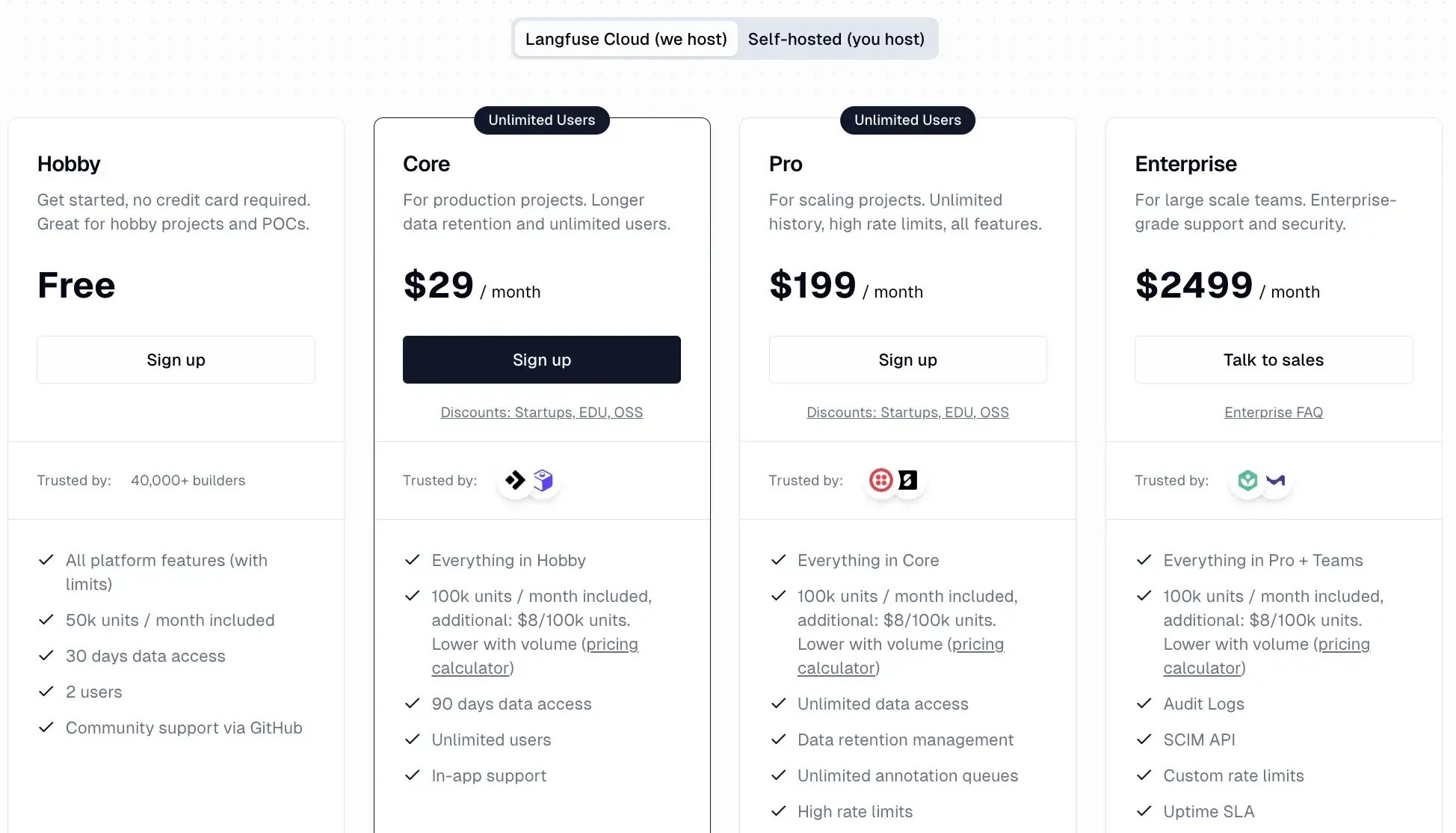 Langfuse is fully open-source, licensed under the Apache 2.0 license, and is free to self-host. For teams that prefer a managed setup, Langfuse Cloud offers tiered pricing: