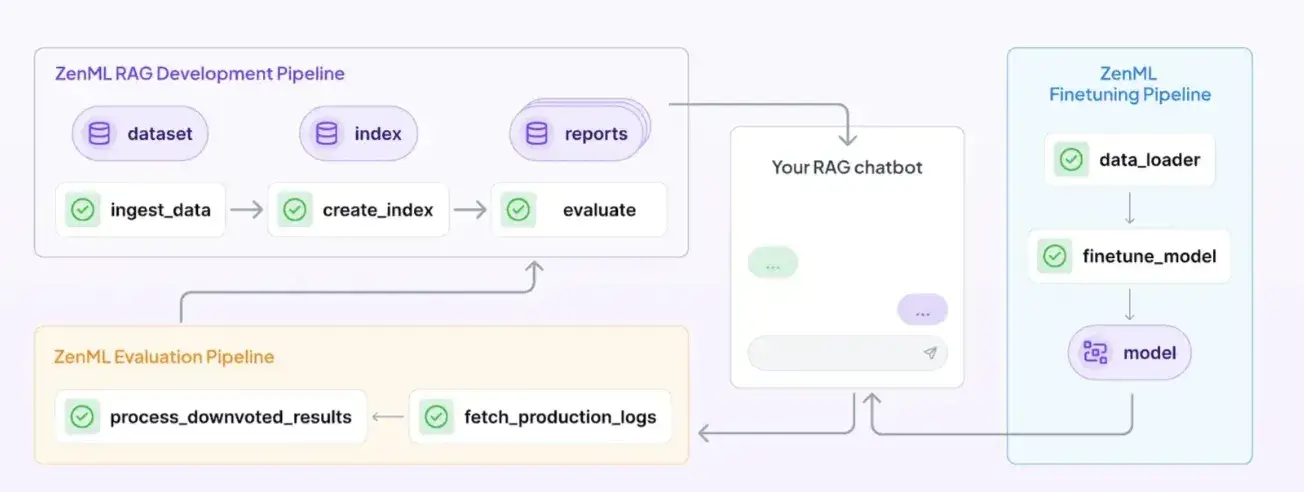 ZenML wraps your entire agent lifecycle into a single, reproducible pipeline of versioned steps.