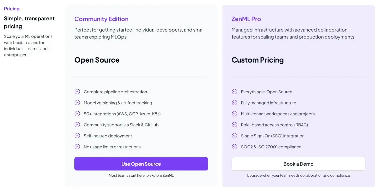 For teams needing enterprise-grade collaboration, managed hosting, and premium support, ZenML offers custom business plans. These are typically usage- or seat-based and are tailored depending on your deployment model (cloud or on-prem).