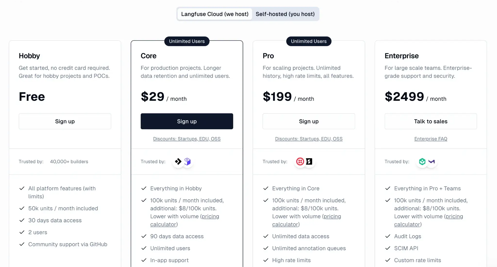 Langfuse is free and open-source to self-host. The company also offers a managed Langfuse Cloud with a generous free ‘Hobby’ tier and three paid plans: