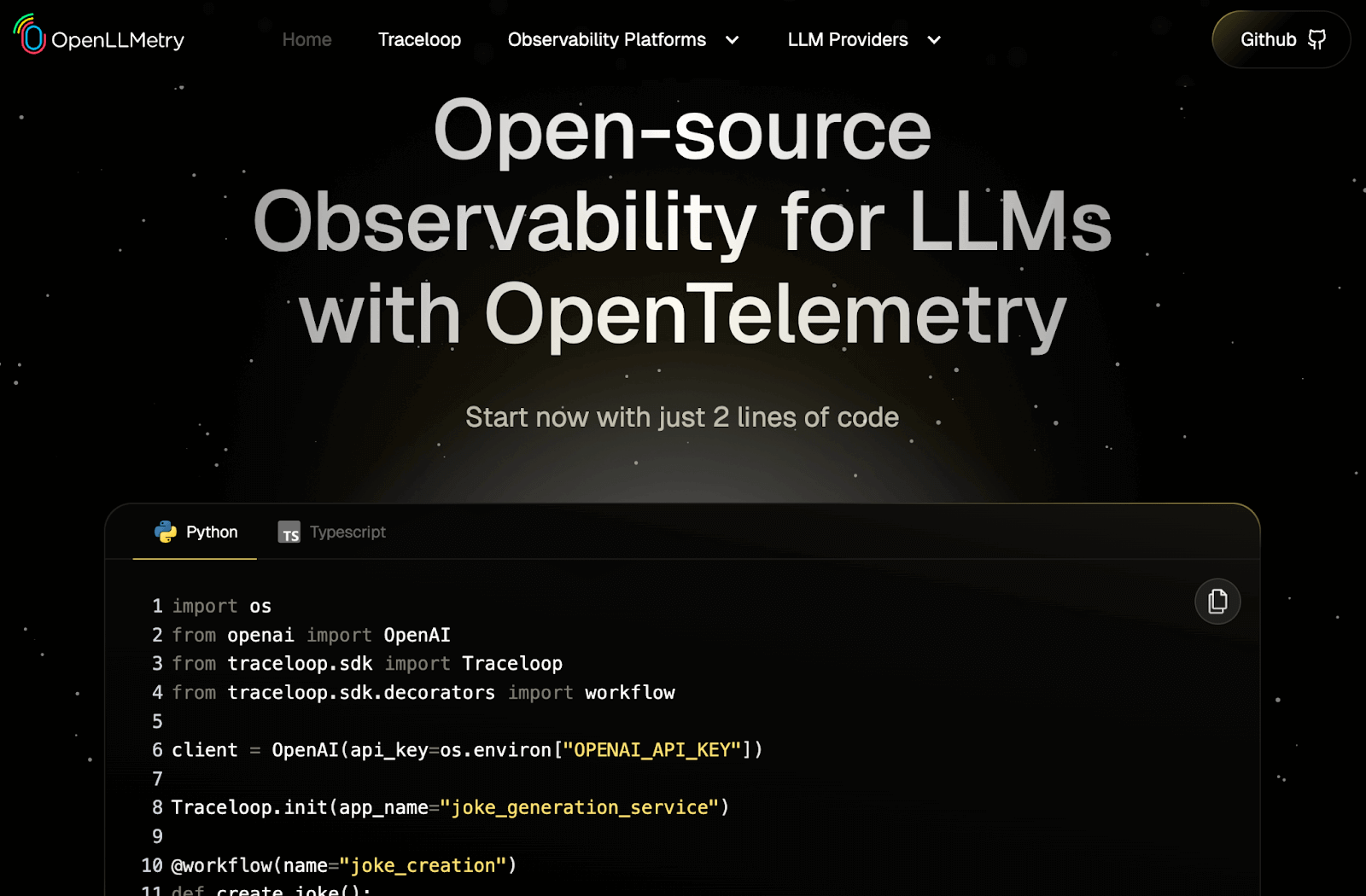 OpenLLMetry (from Traceloop) is an open-source instrumentation library, not a full-stack platform. Its one and only job is to make it easy to capture traces and metrics from your LLM application and send them to any backend you want, using the OpenTelemetry (OTel) standard.