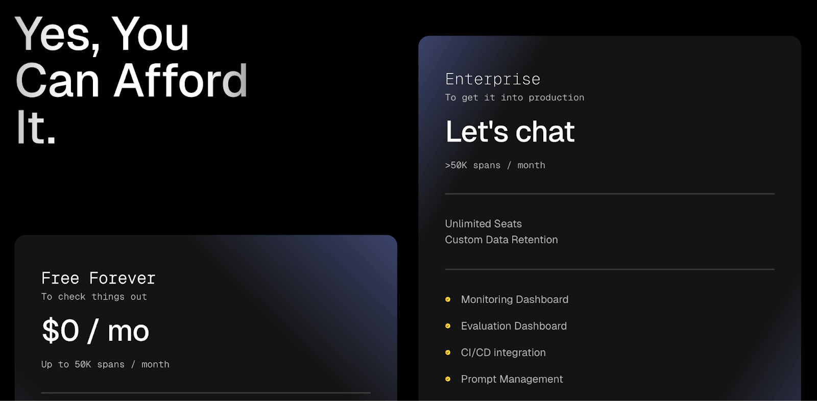 Opik’s strength is that it is open-source with a full feature set. All of its tracing, evaluation, and guardrail functionality is included in the free code. Plus, it also has excellent integrations and is popular among many enterprise teams.