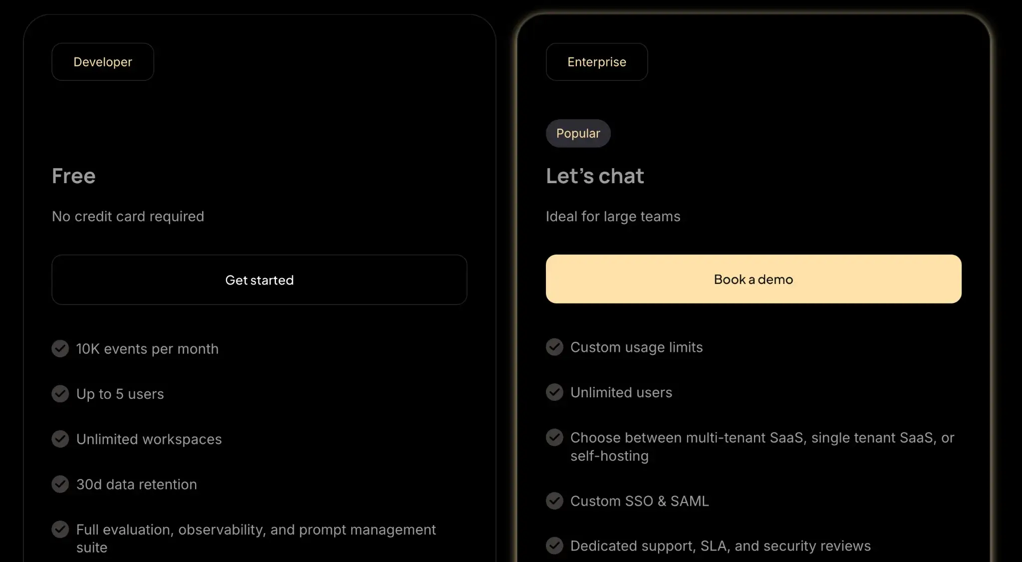 HoneyHive offers a generous free Developer tier capped at 10,000 events/month and 30-day retention, with core observability features. The Enterprise plan includes optional on-prem deployment for regulated teams.