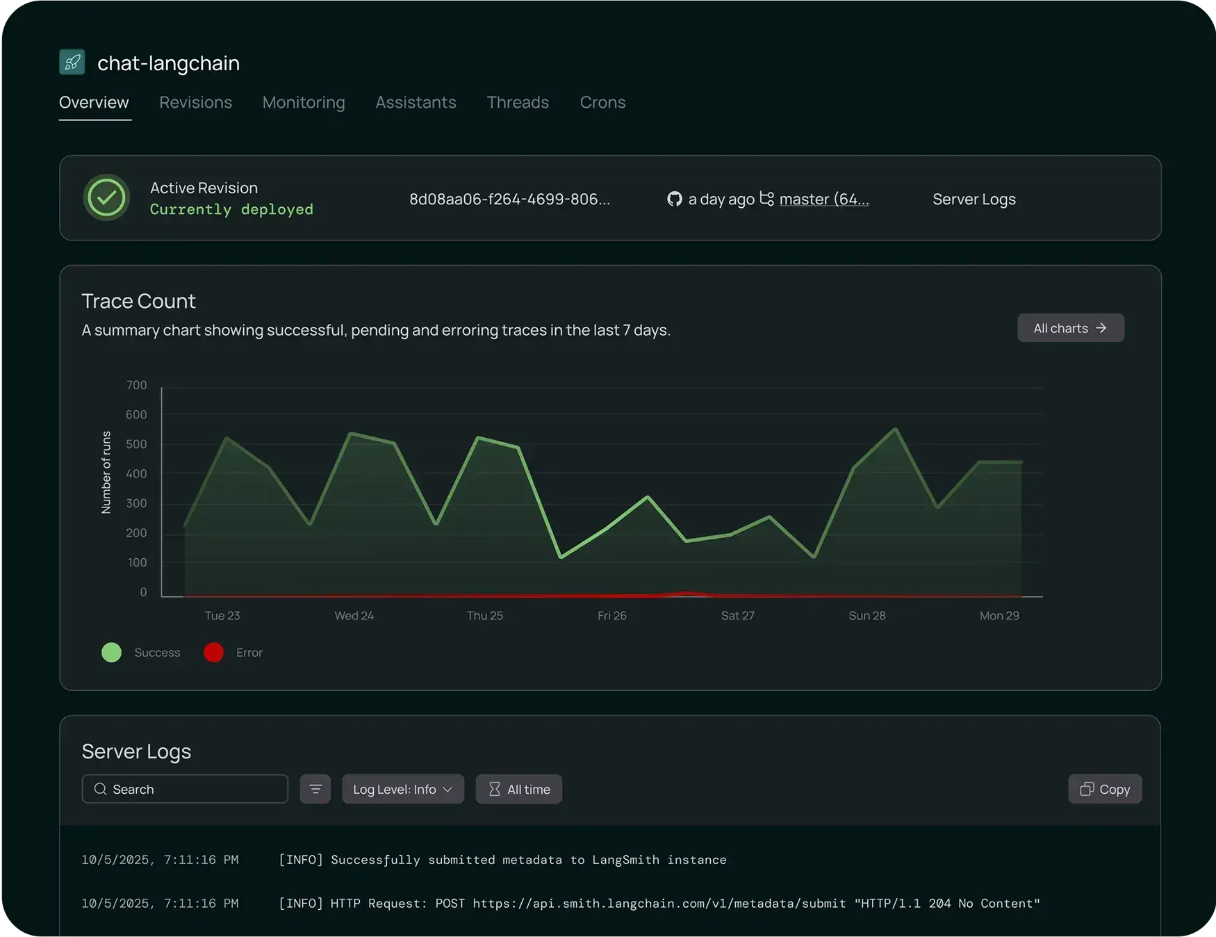 For example, it offers built-in data stores for agent memory, session tracking, and tool outputs. There’s no need to build custom state-store endpoints: LangSmith Deployment provides built-in APIs for conversation threads, checkpoints, and related state management. It also includes version control for your agents, so you can instantly roll back to a previous version if a new release behaves unexpectedly.