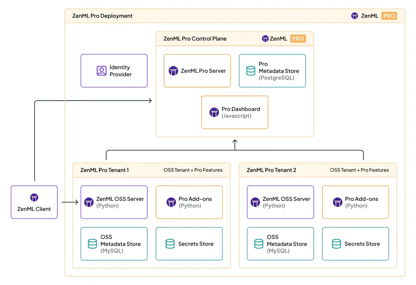 - ZenML Pro (Custom pricing): A managed control plane that handles the dashboard, user management, and stack configurations. This removes the burden of hosting the ZenML server yourself.