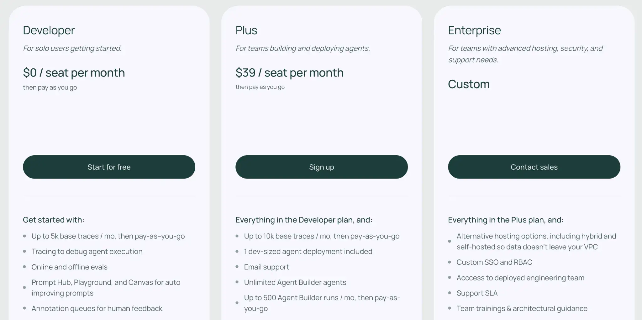 - Developer: $0 per seat/month (1 seat max), includes up to 5k base traces/month, then pay-as-you-go for additional traces.
