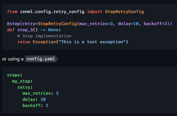 The 0.58.0 release also includes new retry configuration for the steps. The following parameters can be set: StepRetryConfig(max_retries=3, delay=10, backoff=2)