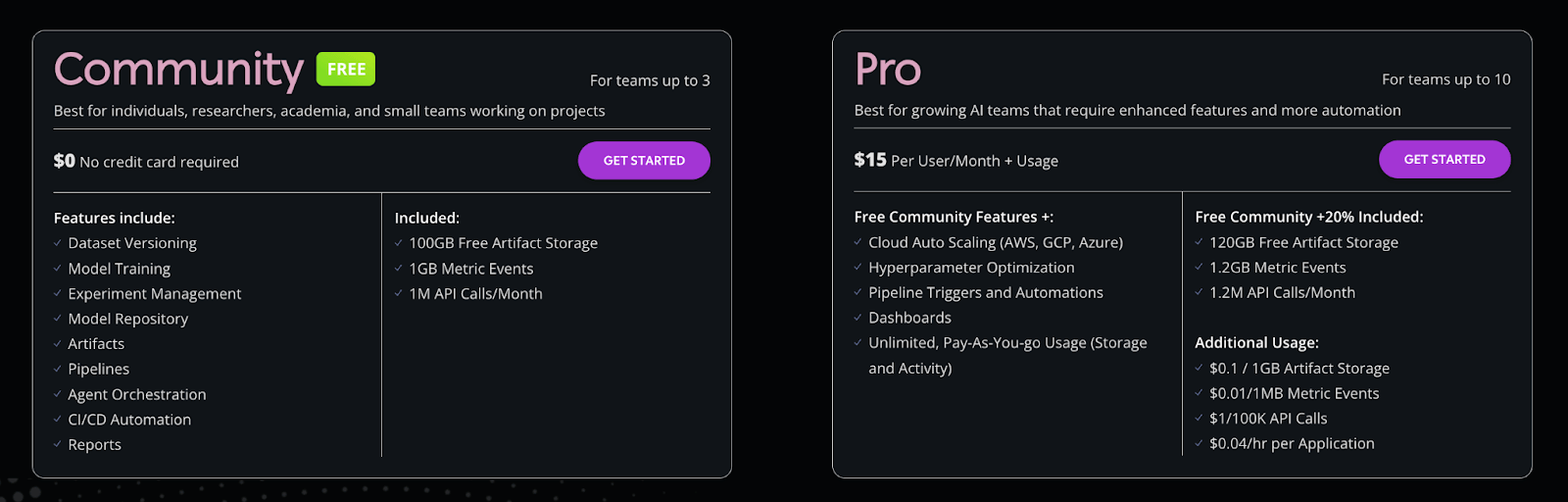 ClearML core open-source is free to self-host. It also has a free hosted tier for individuals, and three paid plans: