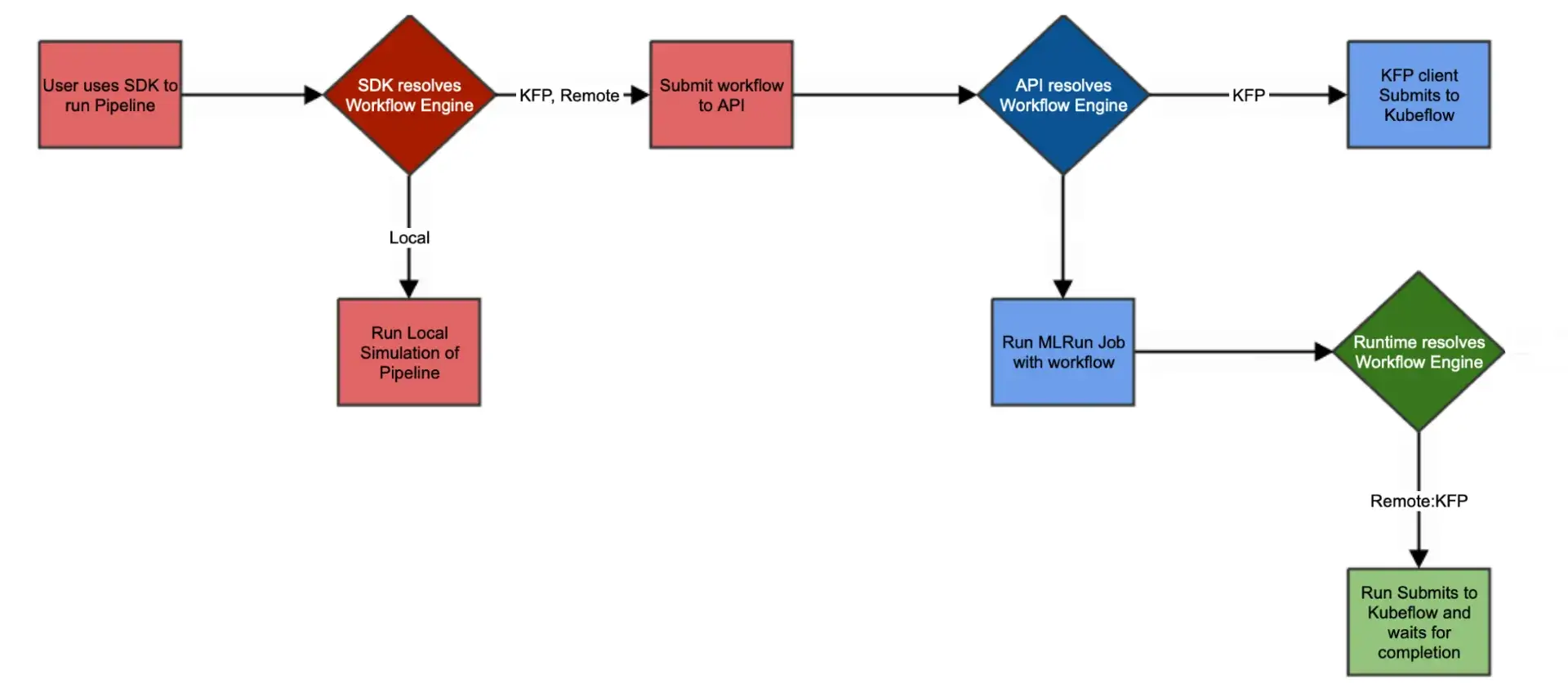 Workflows are defined as Python workflow functions and executed as DAGs via workflow engines such as local execution or Kubeflow Pipelines (KFP), using the MLRun project/workflow APIs. The goal is to reduce Kubernetes boilerplate while still deploying on Kubernetes.