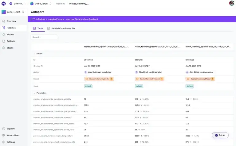 ZenML includes a dashboard for visualising pipelines, runs, steps, artefacts, and associated metadata. Some advanced dashboard views (e.g., experiment comparison or full model control-plane features) depend on the ZenML edition.