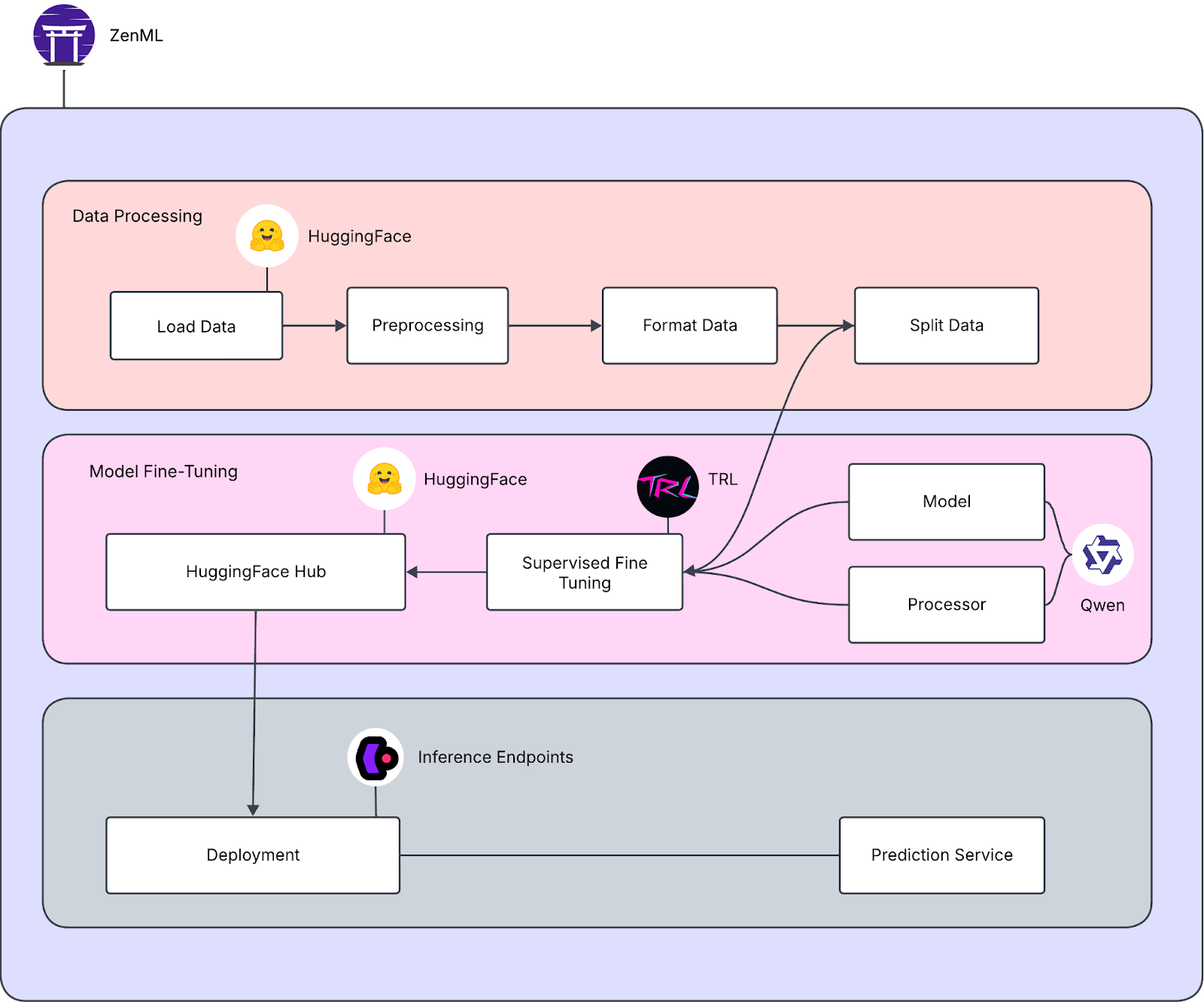 Multimodal AI models are powerful but come with challenges. They need to handle large and diverse datasets and complex integrations. Recent advancements have made building and deploying these models easier, but having a clear process is still important. In this article, we will use ZenML to fine-tune a vision model with Supervised Fine Tuning (SFT) and deploy it on Hugging Face inference endpoints.