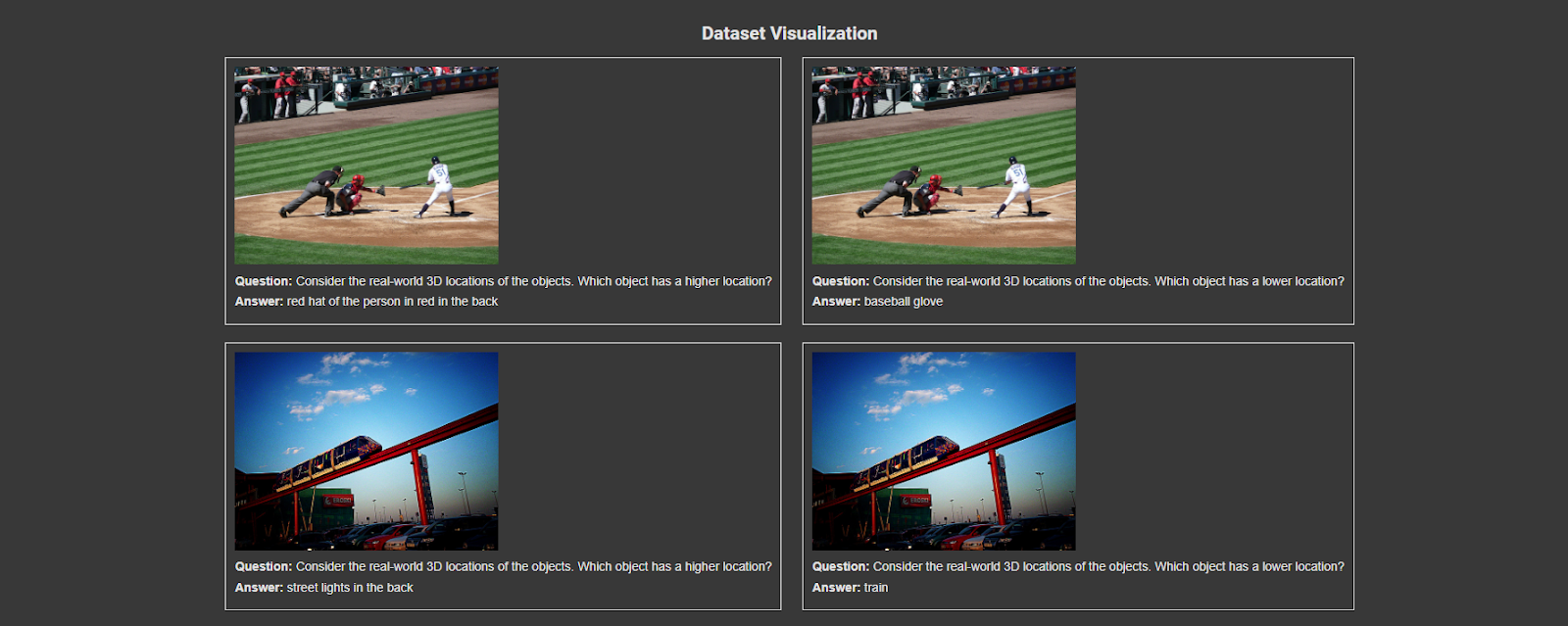 We use the 3DSRBench dataset for spatial reasoning tasks. This dataset is specifically designed to enhance the reasoning capabilities of multimodal language models. It includes images, questions, and answers related to spatial relationships and positioning tasks.