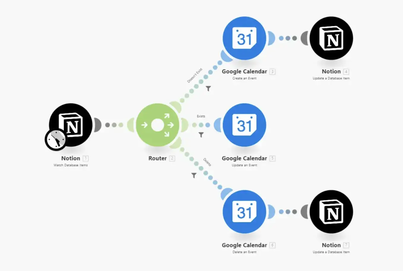 Make takes a slightly different approach to visual workflow building. Instead of 'workflows,' Make uses the term 'scenarios' for its automations. The builder presents a flowchart-style canvas where each step appears as a circular module connected by lines.