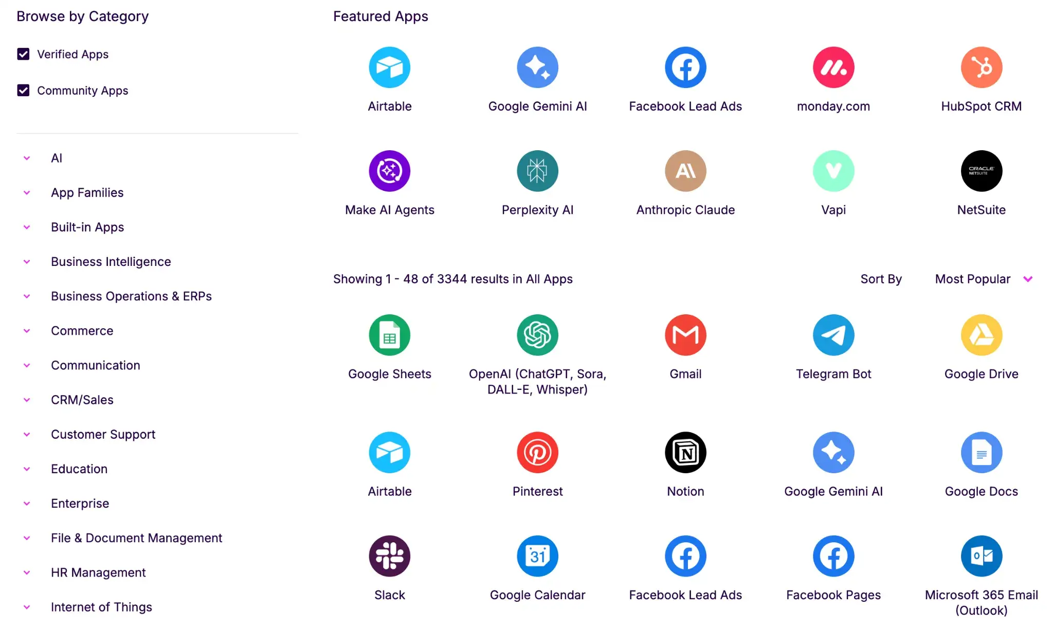 Make dominates in terms of sheer volume. The platform boasts a massive catalog of 3,000+ pre-built apps, covering almost every popular SaaS tool from CRM and marketing to project management.