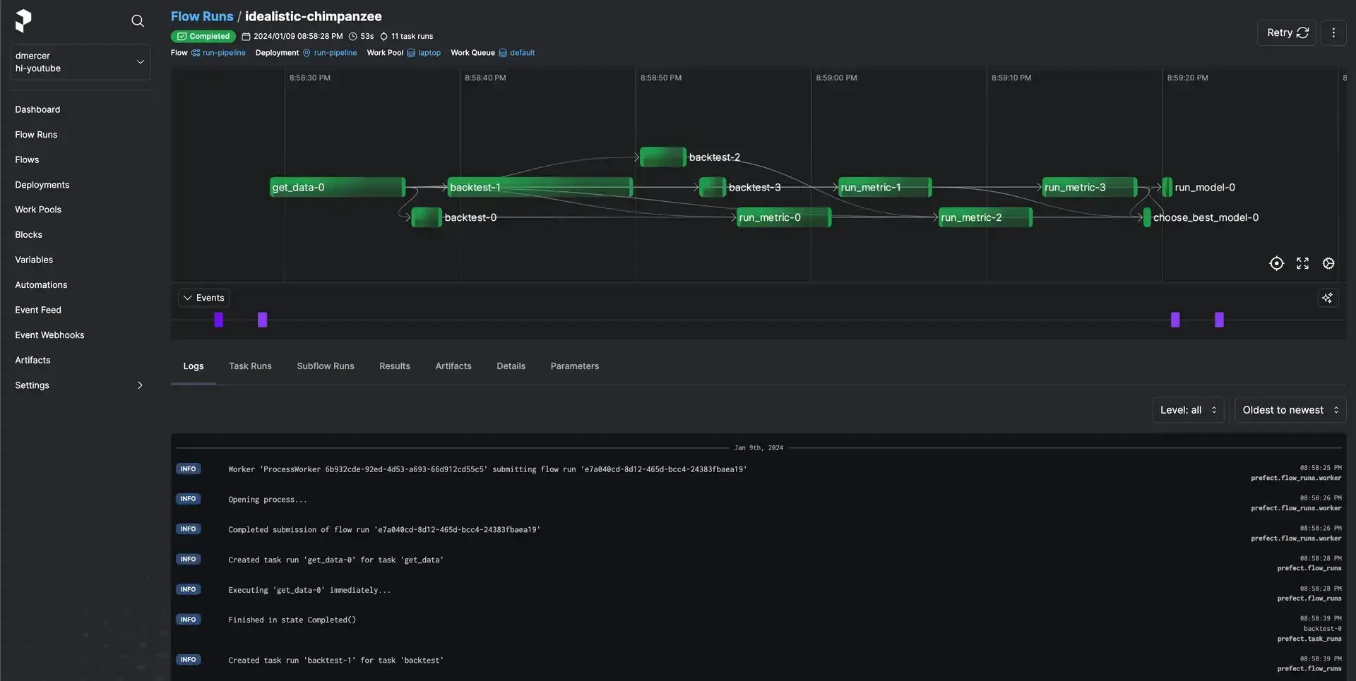 🧑💻 Prefect: A workflow orchestrator designed for data pipelines. It excels at scheduling, retries, and observability without forcing users into a DSL or heavy infrastructure. The framework does not provide ML-native lifecycle concepts such as model versioning or dataset lineage.