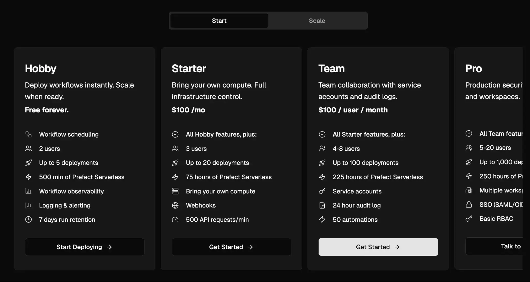 Prefect offers a free forever plan for hobbyists and solo developers. Other than that, it has five paid plans: