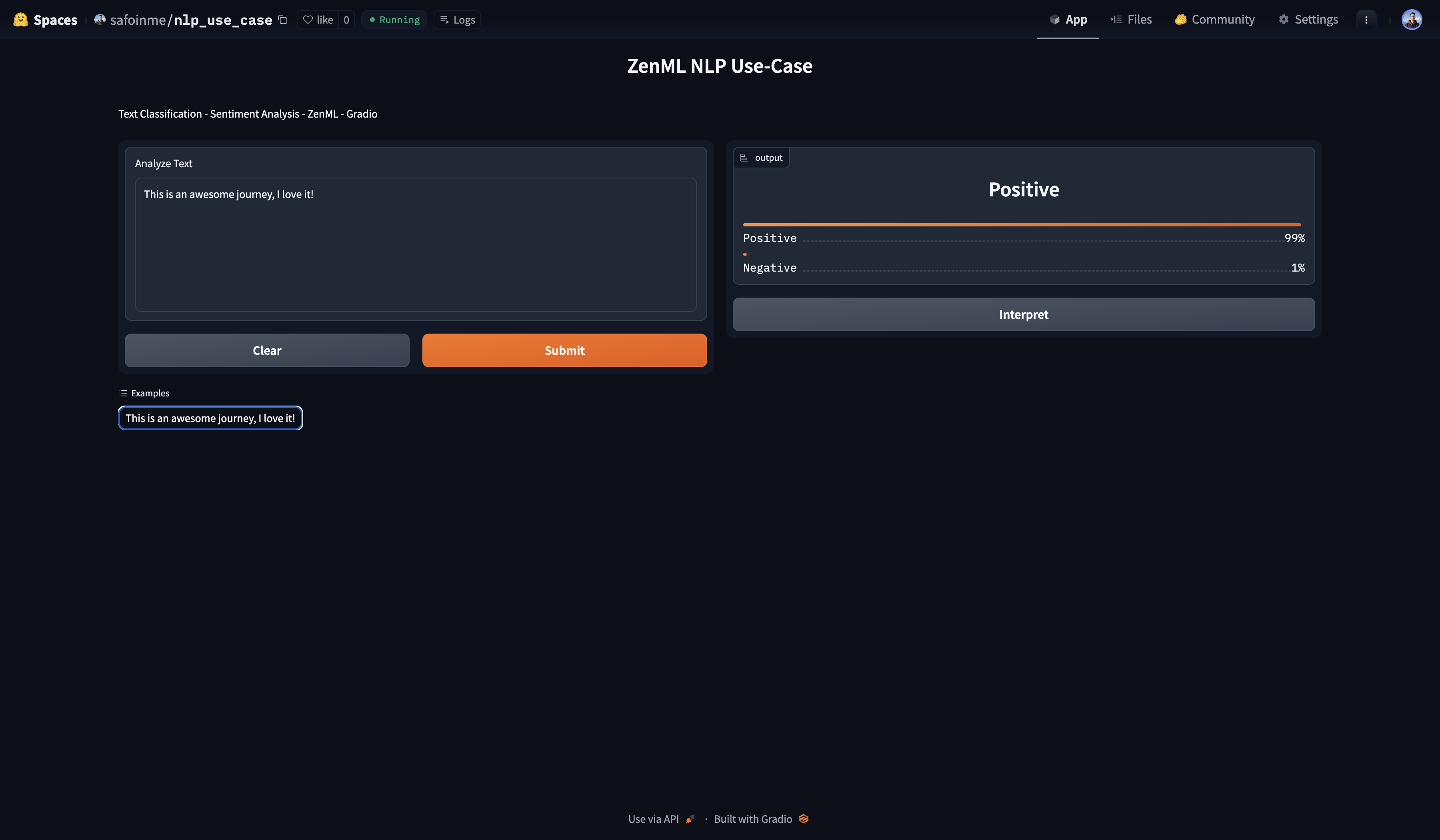 Local deployment is often the first step in bringing your model to life. It allows you to test the model in a controlled environment, ensuring that it behaves as expected before scaling up to a more public or resource-intensive setting. With ZenML, local deployment is straightforward. The template includes a Gradio-based interface, which provides a user-friendly way to interact with your model right from your local machine. This is invaluable for quick iterations and demonstrations, as it gives immediate feedback on how the model performs with real input data.