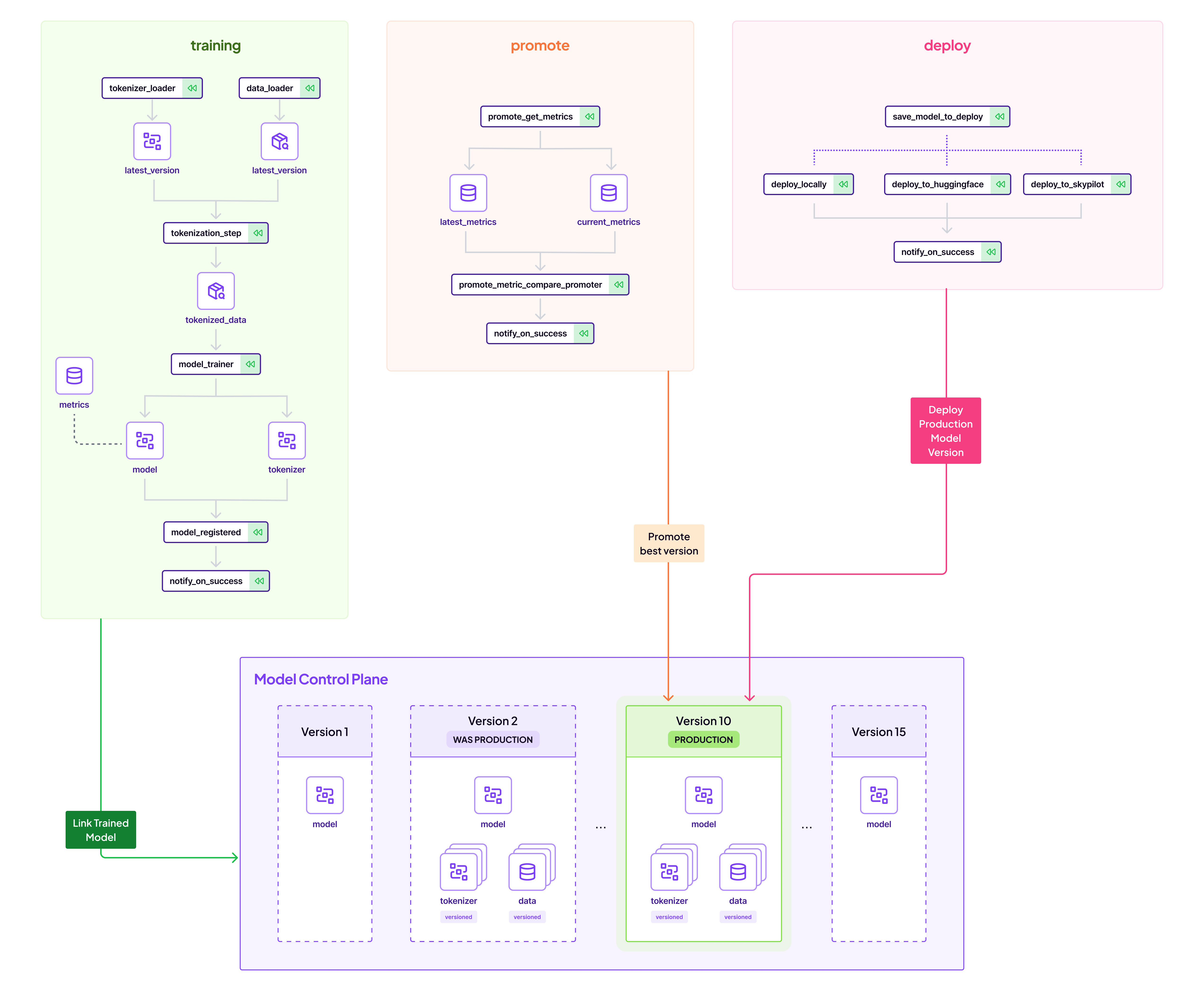 For instance, you can choose the dataset and model from HuggingFace’s vast repository, select your target environment for deployments, and decide whether to deploy locally or to cloud providers like AWS or GCP. The template also allows you to enable or disable metric-based promotion and notifications on pipeline outcomes, giving you control over the model lifecycle management.