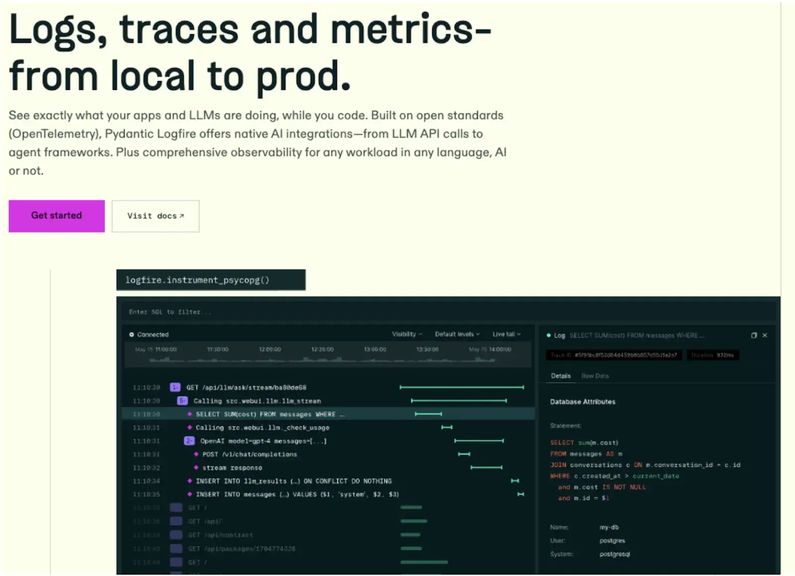Logfire records every model call, prompt, tool invocation, and validation step, displaying them as spans (traceable events) with timing and metadata.