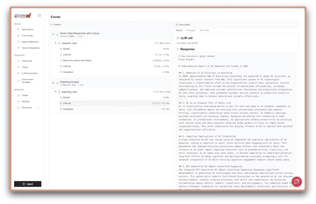 What is CrewAI Tracing? CrewAI’s built-in tracing provides comprehensive observability for your AI agents, including agent decisions, task execution timelines, tool usage, and LLM calls - all accessible through the CrewAI AMP platform.