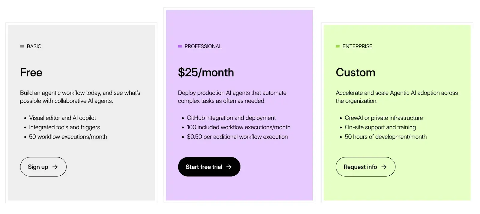 CrewAI's core framework is also open-source and free under an MIT license. For production deployments, CrewAI offers two paid plans, including: