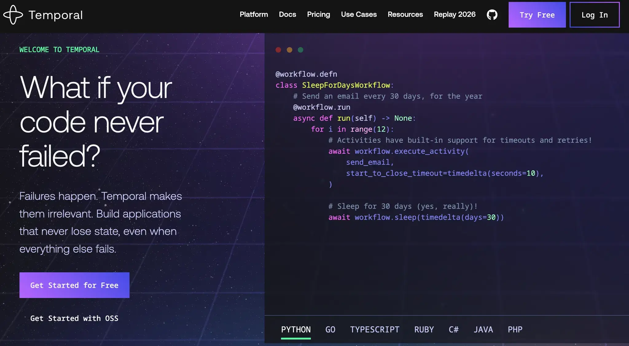 Temporal treats each workflow as a durable stateful function. You write workflows as regular code in any language, like Java, Go, Python, etc., and the Temporal platform handles execution and recovery.
