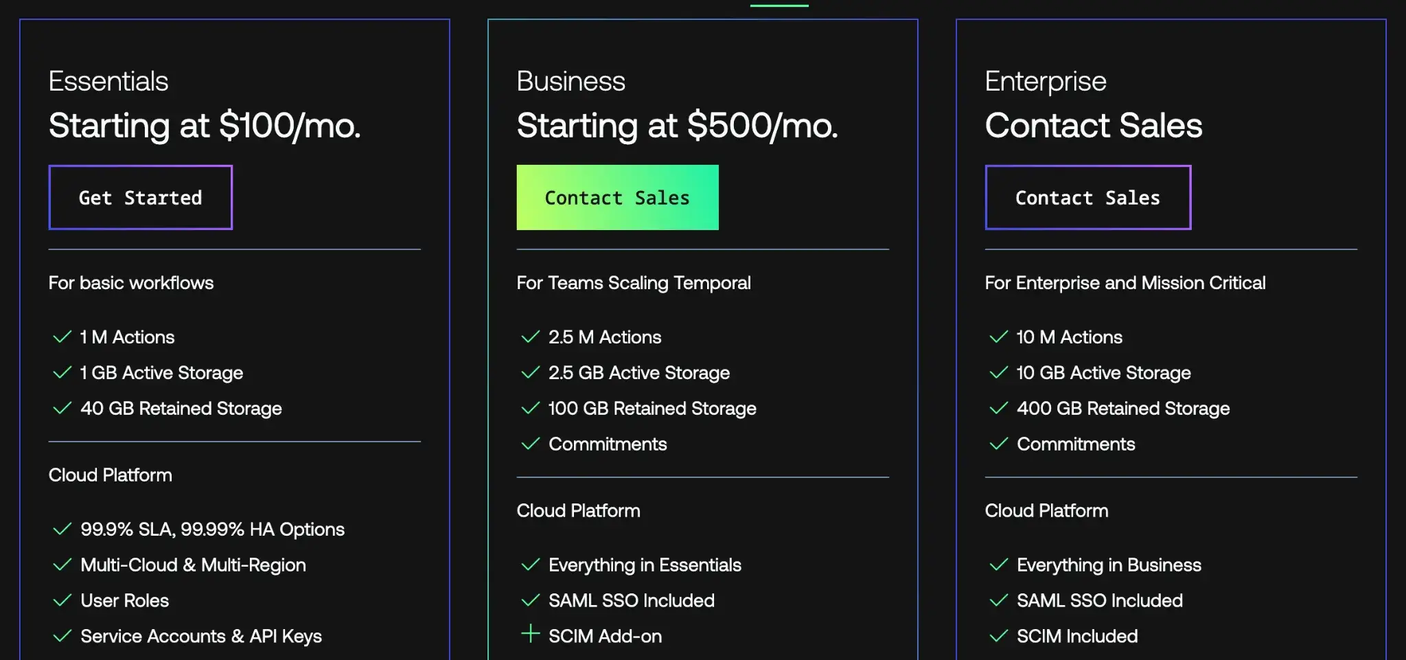 The core Temporal platform is completely open source (MIT license) and can be self-hosted at no cost. Temporal also offers Temporal Cloud, a hosted SaaS version with paid plans as follows: