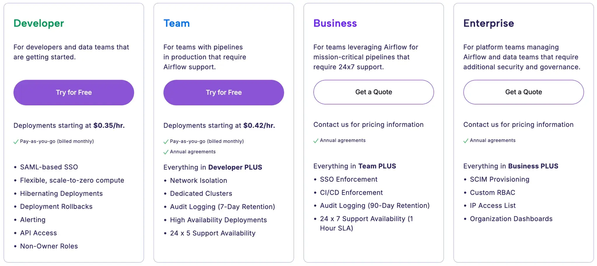 But for managed services, you can visit the Astronomer website. It offers 4 usage-based pricing plans to choose from: